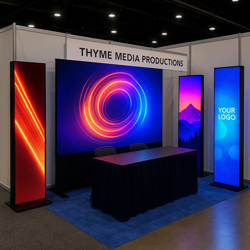Eye-catching LED wall solutions for 10×10, 10×20, and island booths. Modular layouts, corner wraps, and vertical signage.